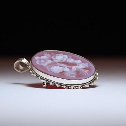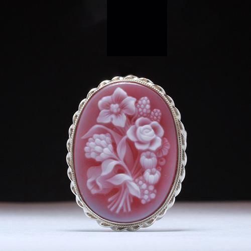 このレッドメノウカメオブローチ兼ペンダントトップは、繊細なフラワーモチーフが美しく刻まれたデザインが特徴です。